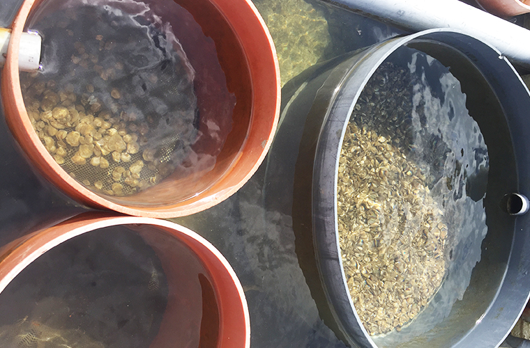 Afhankelijk van de soort groeien ze hier twee tot drie jaar waarbij ze dagelijks tot 50 liter zeewater filteren via hun gedeeltelijk geopende schelpen.